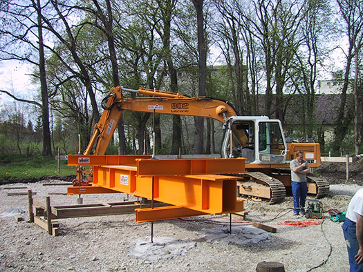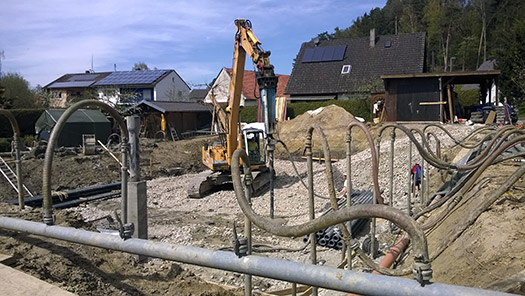 Der Einbau erfolgt mit einem leistungsstarken Hydraulik- Kettenbagger der auch bei beengten Platzverhältnissen einsetzbar ist. Die Anforderungen bzgl. der Standfläche sind deutlich geringer und damit kostengünstiger als bei üblichen Bohr- und Rammgeräten.